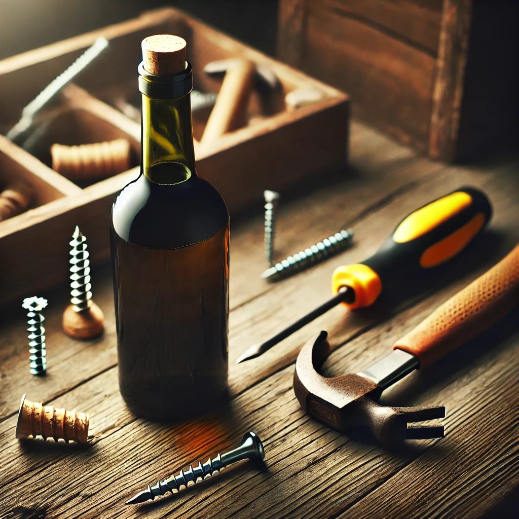 Skoro nie mamy korkociągu, możemy wykonać jego „imitację”, korzystając z zestawu małego majsterkowicza. Metoda ta jest niezwykle skuteczna, ale wymaga cierpliwości, siły i pewnych umiejętności manualnych.