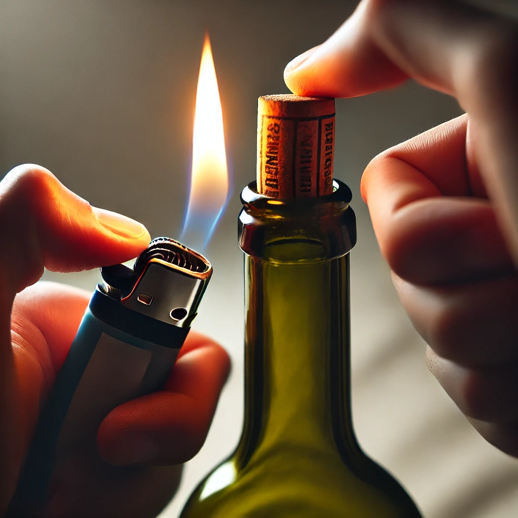 Polega ona na tym, aby za pomocą zapalniczki lub palnika delikatnie ogrzewać szyjkę butelki, czyli miejsce tuż pod korkiem. Nagrzane szkło powinno spowodować, że korek zacznie się przesuwać w górę i ostatecznie opuści butelkę.
