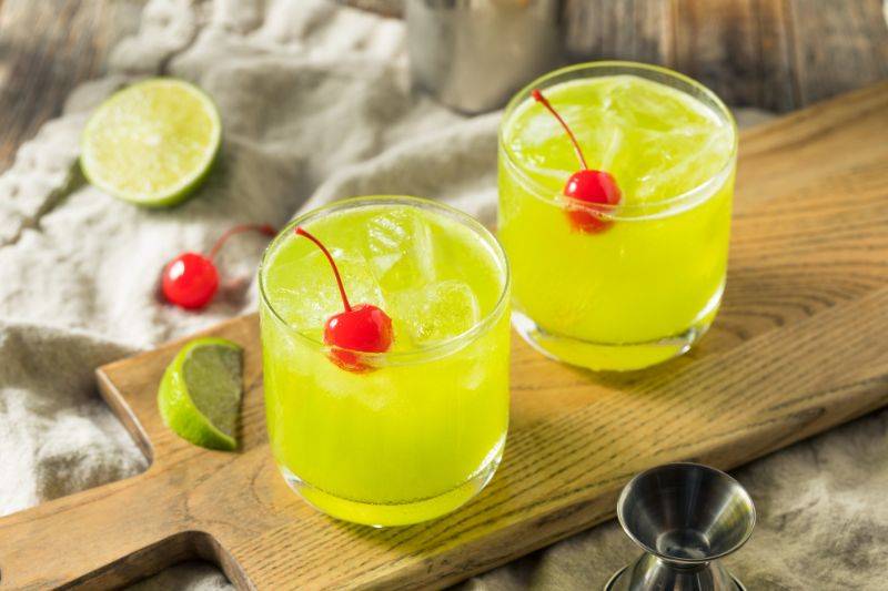 - Intensywne, neonowe kolory drinków. Podobnie jak w przypadku mody tutaj również królowały dość wyraziste, rzucające się w oko barwy. Popularne były drinki z Blue Curacao czy na bazie likieru melonowego