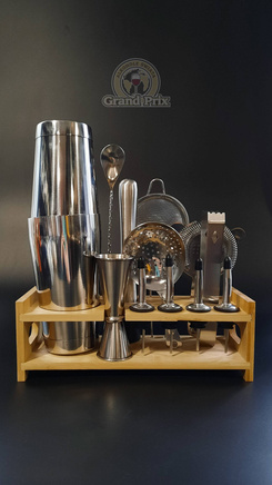( ilość produktów: 3430 )Zestaw barmański 14 elementów z podstawką srebrny shaker Tin on tin
